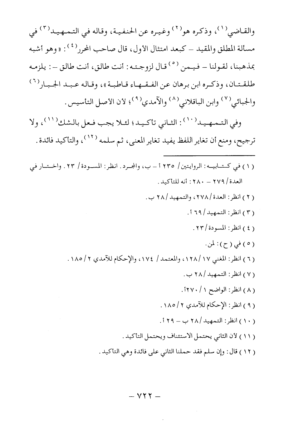 وفي التمهيد (١٠): الثاني تأكيد؛ لئلا يجب فعل بالشك (١١)، ولا ترجيح، ومنع أن تغاير اللفظ يفيد تغاير المعنى، ثم سلمه (١٢)، والتأكيد فائدة.