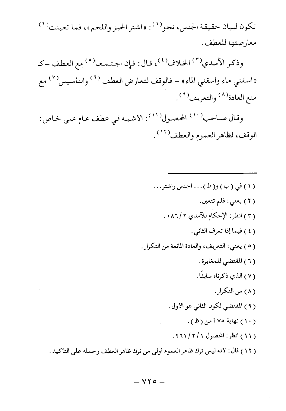 (١٢) قال: لأنه ليس ترك ظاهر العموم أولى من ترك ظاهر العطف وحمله على التأكيد.