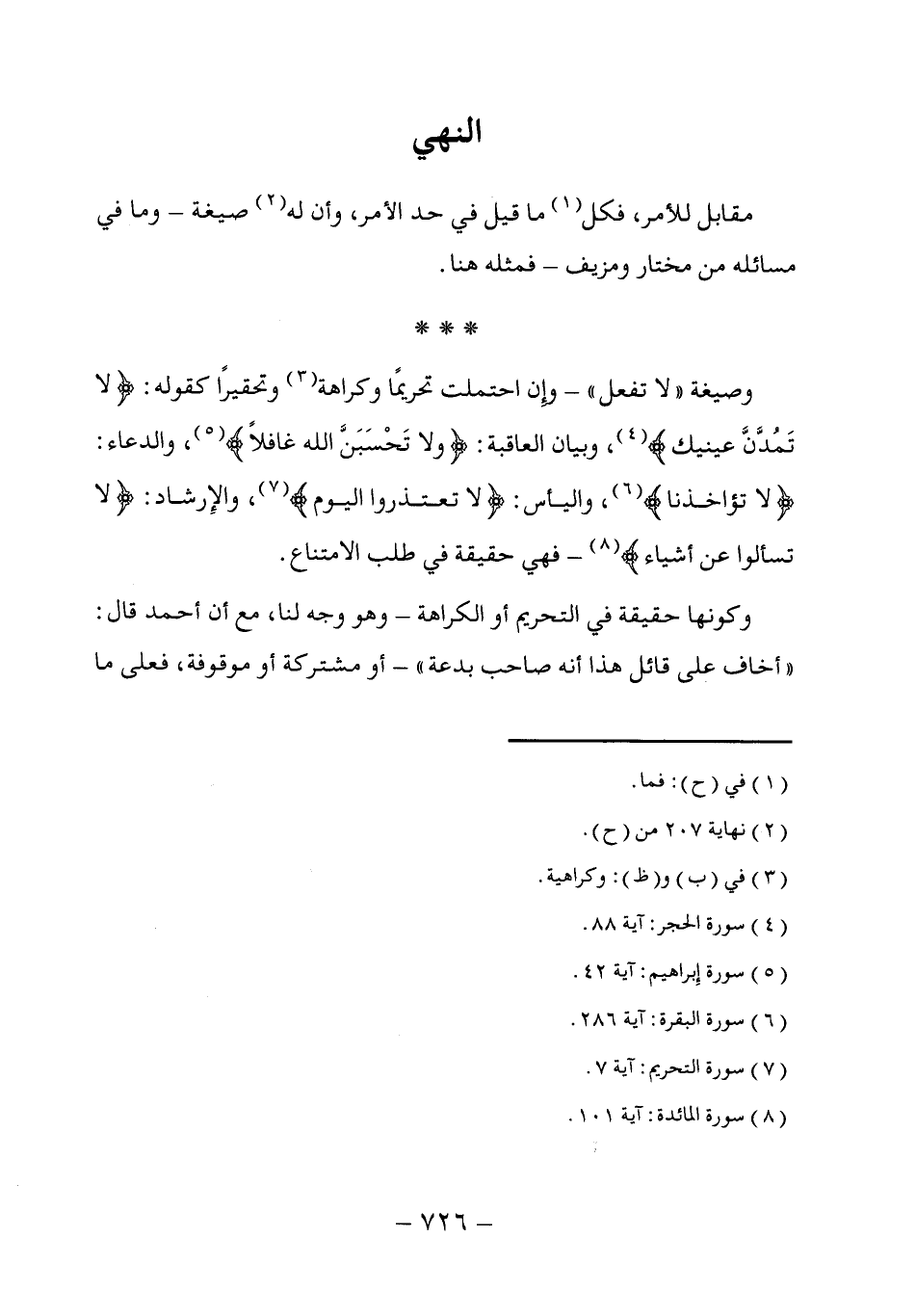 وصيغة "لا تفعل" -وإن احتملت تحريمًا وكراهة (٣) وتحقيرًا كقوله: (لا تَمُدَّنَّ عينيك) (٤)، وبيان العاقبة: (ولا تَحْسَبَنَّ الله غافلاً) (٥)، والدعاء: (لا تؤاخذنا) (٦)، واليأس: (لا تعتذروا اليوم) (٧)، والإِرشاد: (لا تسألوا عن أشياء) (٨) - فهي حقيقة في طلب الامتناع.