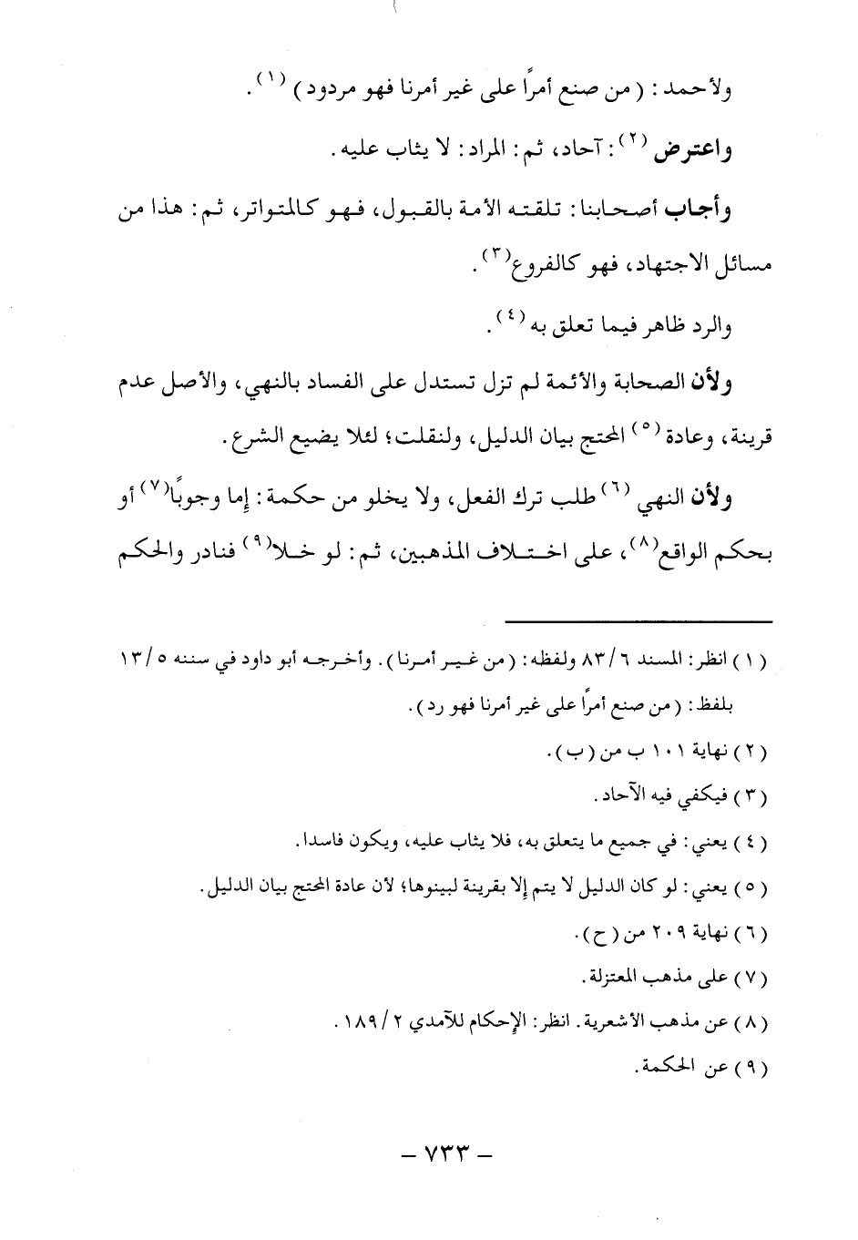 (١) انظر: المسند ٦/ ٨٣ ولفظه: (من غير أمرنا). وأخرجه أبو داود في سننه ٥/ ١٣ بلفظ: (من صنع أمرًا على غير أمرنا فهو رد).