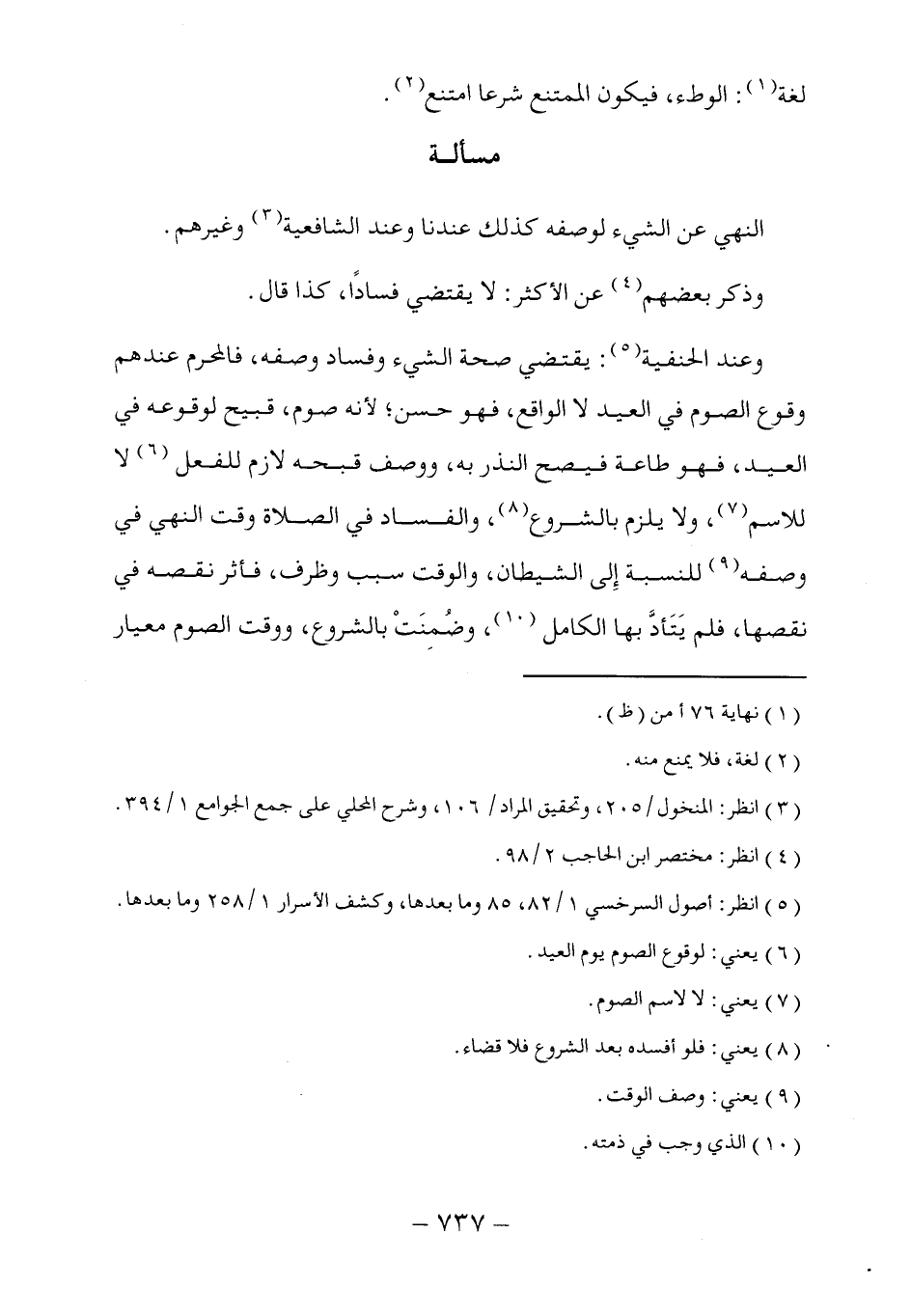 وعند الحنفية (٥): يقتضي صحة الشيء وفساد وصفه، فالمحرم عندهم وقوع الصوم في العيد لا الواقع، فهو حسن؛ لأنه صوم، قبيح لوقوعه في العيد، فهو طاعة فيصح النذر به، ووصف قبحه لازم للفعل (٦) لا للاسم (٧)، ولا يلزم بالشروع (٨)، والفساد في الصلاة وقت النهي في وصفه (٩) للنسبة إِلى الشيطان، والوقت سبب وظرف، فأثر نقصه في نقصها، فلم يَتَأدَّ بها الكامل (١٠)، وضُمِنَتْ بالشروع، ووقت الصوم معيار