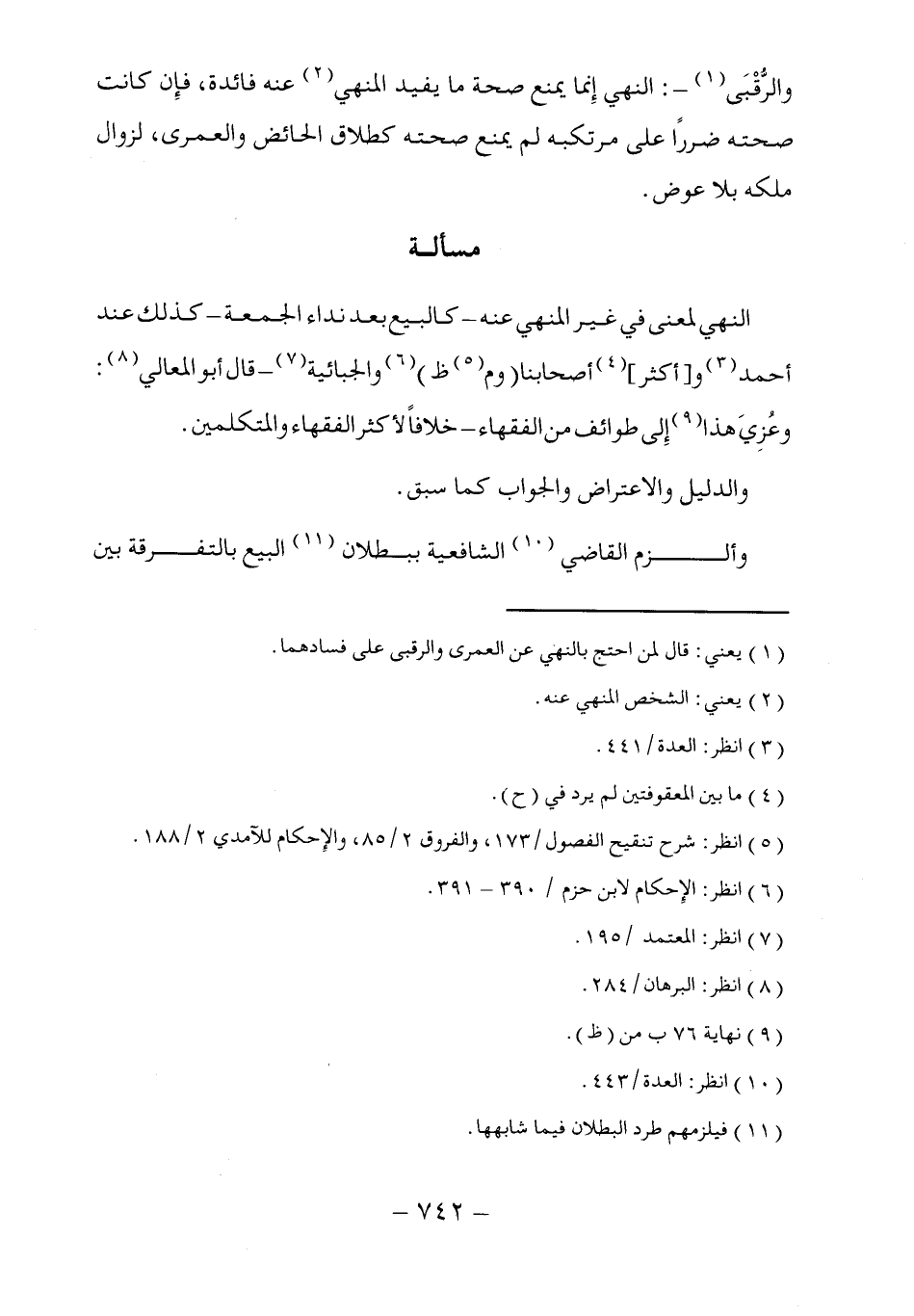والرُّقْبَى (١) -: النهي إِنما يمنع صحة ما يفيد النهي (٢) عنه فائدة، فإِن كانت صحته ضررًا على مرتكبه لم يمنع صحته كطلاق الحائض والعمرى، لزوال ملكه بلا عوض.