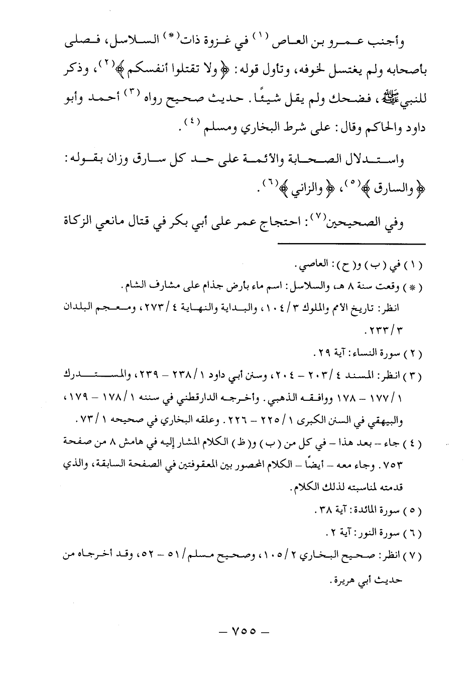 وأجنب عمرو بن العاص (١) في غزوة ذات (*) السلاسل، فصلى بأصحابه ولم يغتسل لخوفه، وتأول قوله: (ولا تقتلوا أنفسكم) (٢)، وذكر للنبي - صلى الله عليه وسلم -، فضحك ولم يقل شيئًا. حديث صحيح رواه (٣) أحمد وأبو داود والحاكم وقال: على شرط البخاري ومسلم (٤).