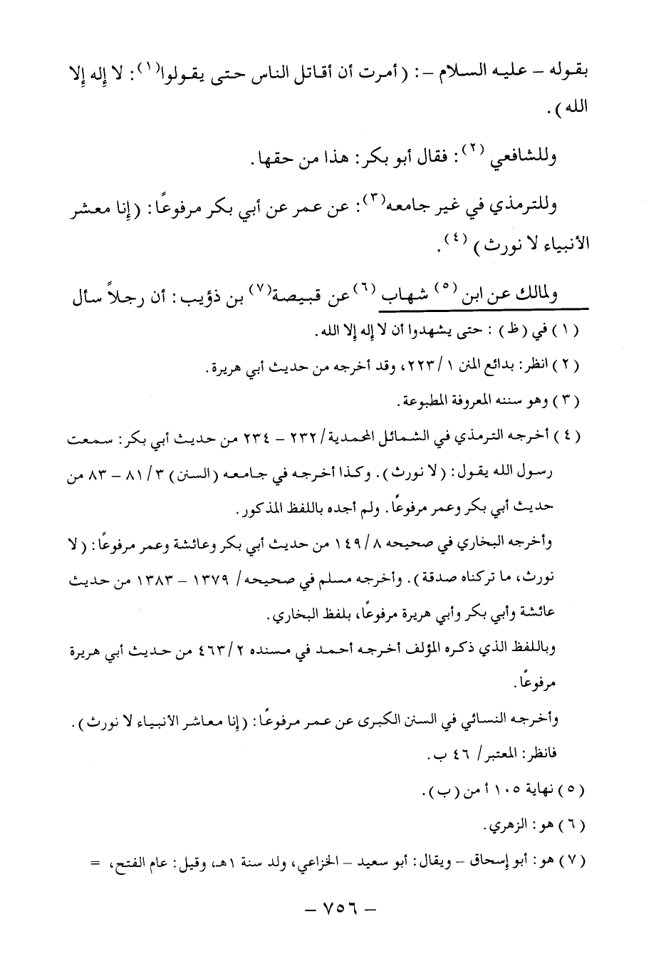 (٤) أخرجه الترمذي في الشمائل المحمدية/ ٢٣٢ - ٢٣٤ من حديث أبي بكر: سمعت رسول الله يقول: (لا نورث). وكذا أخرجه في جامعه (السنن) ٣/ ٨١ - ٨٣ من حديث أبي بكر وعمر مرفوعًا. ولم أجده باللفظ المذكور.