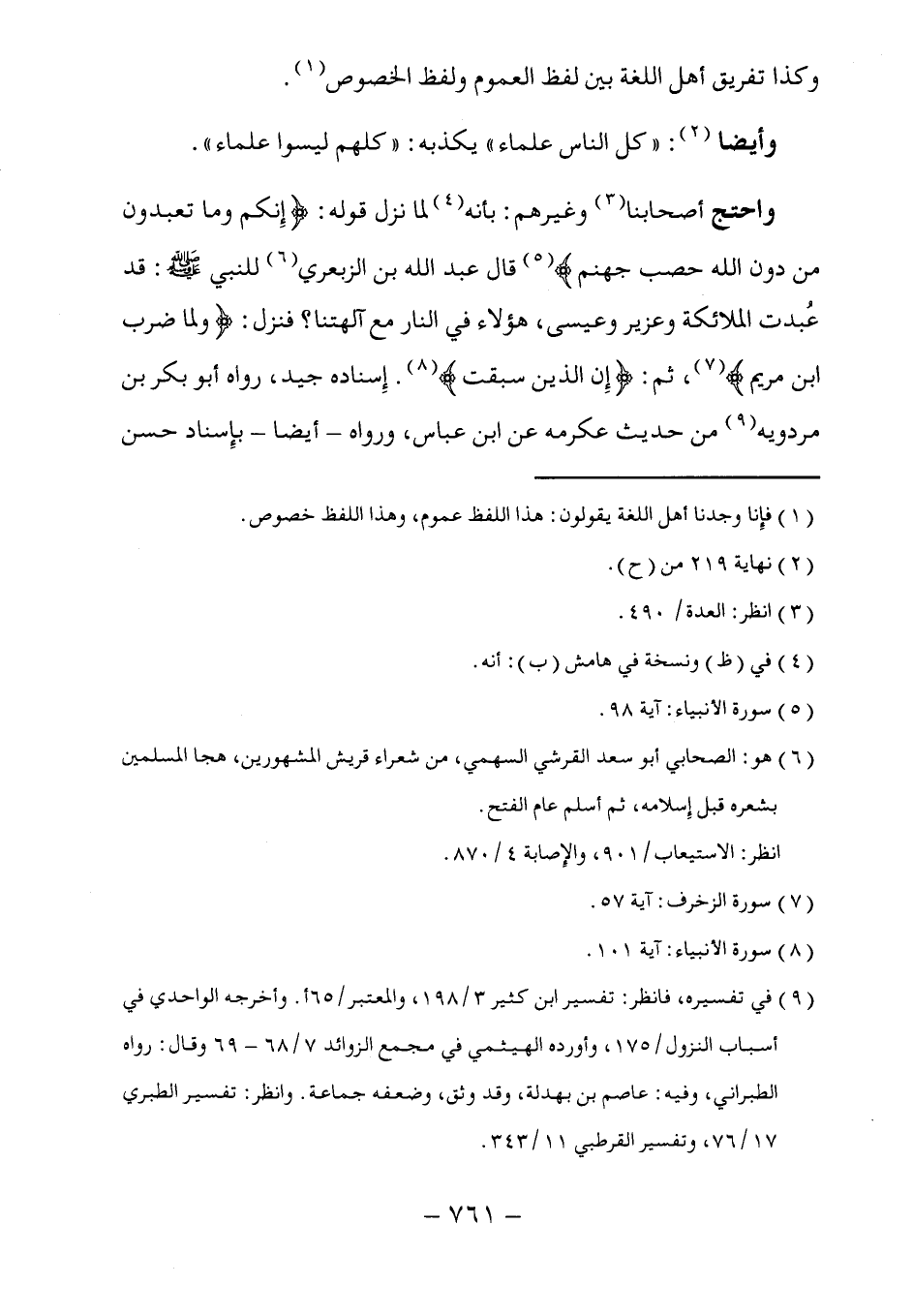 واحتج أصحابنا (٣) وغيرهم: بأنه (٤) لما نزل قوله: (إِنكم وما تعبدون من دون الله حصب جهنم) (٥) قال عبد الله بن الزبعري (٦) للنبي - صلى الله عليه وسلم -: قد عُبدت الملائكة وعزير وعيسى، هؤلاء في النار مع آلهتنا؟ فنزل: (ولما ضرب ابن مريم) (٧)، ثم: (إِن الذين سبقت) (٨). إِسناده جيد، رواه أبو بكر بن مردويه (٩) من حديث عكرمة عن ابن عباس، ورواه -أيضاً- بإِسناد حسن