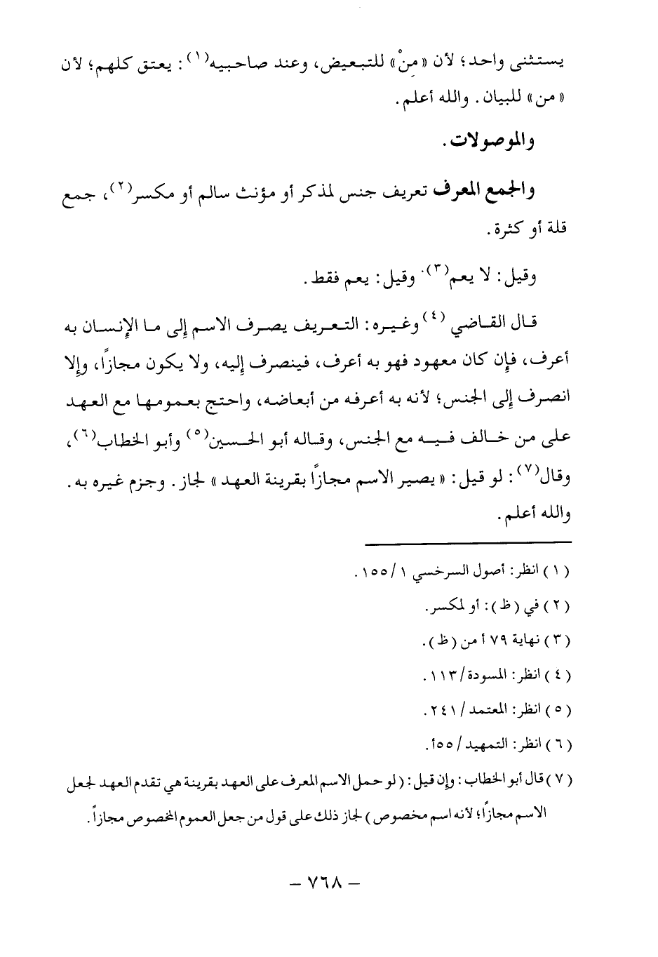 والجمع المعرف تعريف جنس لمذكر أو مؤنث سالم أو مكسر (٢)، جمع قلة أو كثرة.