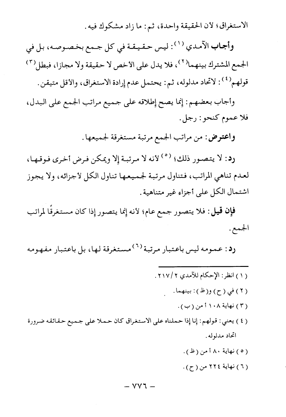 رد: لا يتصور ذلك؛ (٥) لأنه لا مرتبة إِلا ويمكن فرض أخرى فوقها، لعدم تناهي المراتب، فتناول مرتبة لجميعها تناول الكل لأجزائه، ولا يجوز اشتمال الكل على أجزاء غير متناهية.
