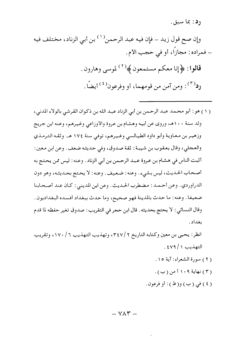 (١) هو: أبو محمَّد عبد الرحمن بن أبي الزناد عبد الله بن ذكوان القرشي بالولاء المدني، ولد سنة ١٠٠ هـ، وروى عن أبيه وهشام بن عروة والأوزاعي وغيرهم، وعنه ابن جريج وزهير بن معاوية وأبو داود الطيالسي وغيرهم، توفي سنة ١٧٤ هـ. وثقه الترمذي والعجلي، وقال يعقوب بن شيبة: ثقة صدوق، وفي حديثه ضعف. وعن ابن معين: أثبت الناس في هشام بن عروة عبد الرحمن بن أبي الزناد. وعنه: ليس ممن يحتج به أصحاب الحديث، ليس بشيء. وعنه: ضعيف. وعنه: لا يحتج بحديثه، وهو دون الدراوردي. وعن أحمد: مضطرب الحديث. وعن ابن المديني: كان عند أصحابنا ضعيفاً. وعنه: ما حدث بالمدينة فهو صحيح، وما حدث ببغداد أفسده البغداديون. وقال النسائي: لا يحتج بحديثه. قال ابن حجر في التقريب: صدوق تغير حفظه لما قدم بغداد.