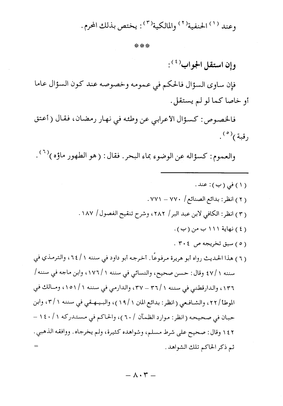 (٦) هذا الحديث رواه أبو هريرة مرفوعًا. أخرجه أبو داود في سننه ١/ ٦٤، والترمذي في سننه ١/ ٤٧ وقال: حسن صحيح، والنسائي في سننه ١/ ١٧٦، وابن ماجه في سننه / ١٣٦، والدارقطني في سننه ١/ ٣٦ - ٣٧، والدارمي في سننه ١/ ١٥١، ومالك في الموطأ/ ٢٢، والشافعي (انظر: بدائع المنن ١/ ١٩)، والبيهقي في سننه ١/ ٣، وابن حبان في صحيحه (انظر: موارد الظمآن/ ٦٠)، والحاكم في مستدركه ١/ ١٤٠ - ١٤٢ وقال: صحيح على شرط مسلم، وشواهده كثيرة، ولم يخرجاه. ووافقه الذهبي. ثم ذكر الحاكم تلك الشواهد.