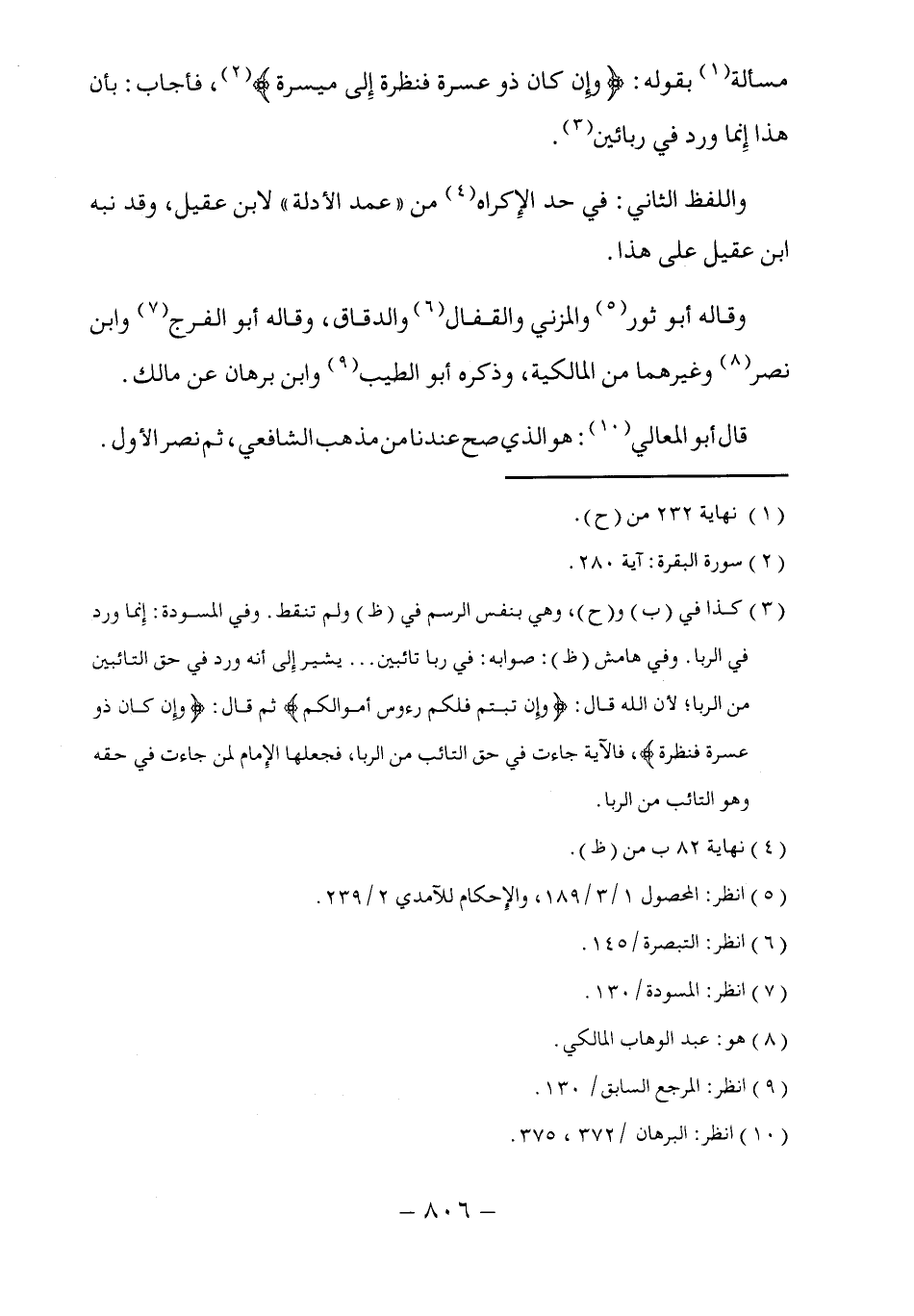 (٣) كذا في (ب) و (ح)، وهي بنفس الرسم في (ظ) ولم تنقط. وفي المسودة: إِنما ورد في الربا. وفي هامش (ظ): صوابه: في ربا تائبين ... يشير إِلى أنه ورد في حق التائبين من الربا؛ لأن الله قال: (وإن تبتم فلكم رءوس أموالكم) ثم قال: (وإن كان ذو عسرة فنظرة)، فالآية جاءت في حق التائب من الربا، فجعلها الإِمام لمن جاءت في حقه وهو التائب من الربا.