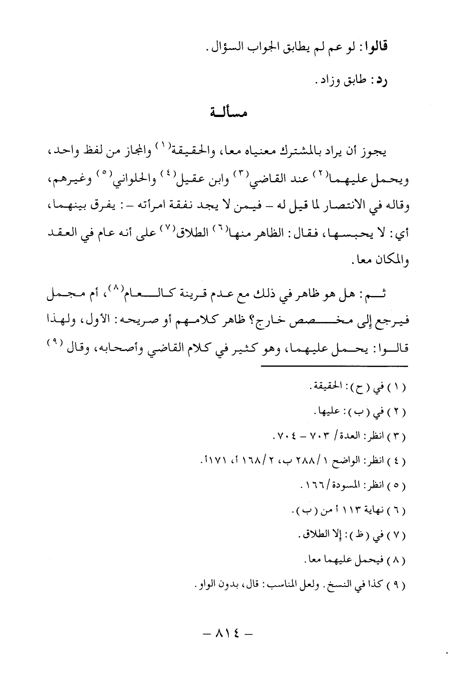 يجوز أن يراد بالمشترك معنياه معا، والحقيقة (١) والمجاز من لفظ واحد، ويحمل عليهما (٢) عند القاضي (٣) وابن عقيل (٤) والحلواني (٥) وغيرهم، وقاله في الانتصار لما قيل له -فيمن لا يجد نفقة امرأته-: يفرق بينهما، أي: لا يحبسها، فقال: الظاهر منها (٦) الطلاق (٧) على أنه عام في العقد والمكان معا.