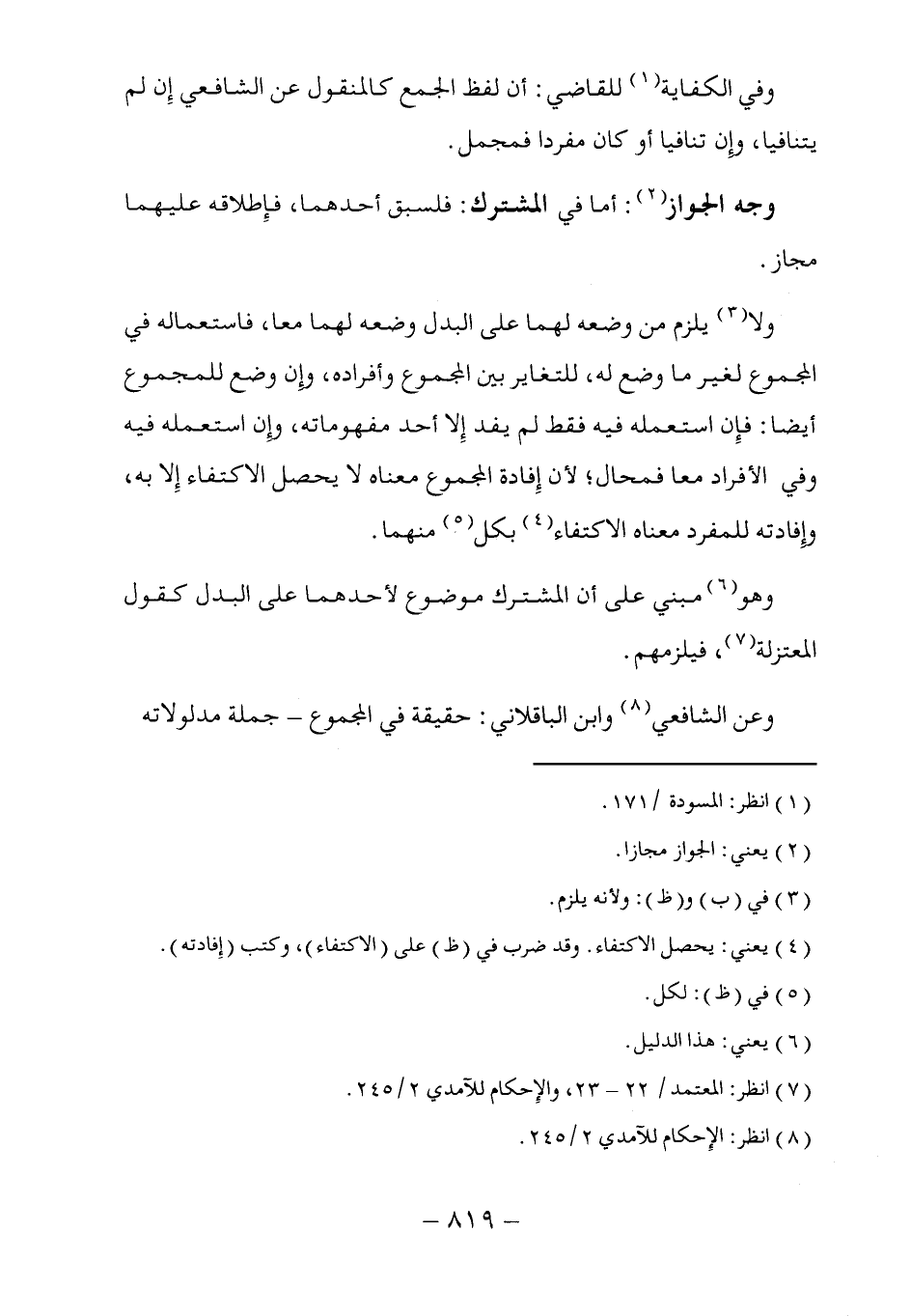 وعن الشافعي (٨) وابن الباقلاني: حقيقة في المجموع -جملة مدلولاته