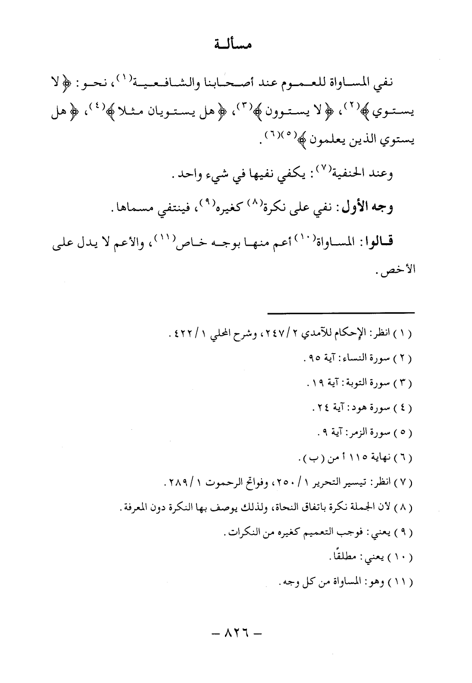 نفي المساواة للعموم عند أصحابنا والشافعية (١)، نحو: (لا يستوي) (٢)] (لا يستوون) (٣)] (هل يستويان مثلا) (٤)] (هل يستوي الذين يعلمون) (٥) (٦).