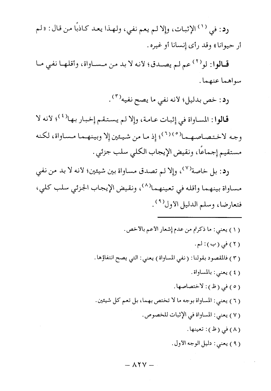 رد: بل خاصة (٧)، وإِلا لم تصدق مساواة بين شيئين؛ لأنه لا بد من نفي مساواة بينهما وأقله في تعينهما (٨)، ونقيض الإِيجاب الجزئي سلب كلي، فتعارضا، وسلم الدليل الأول (٩).