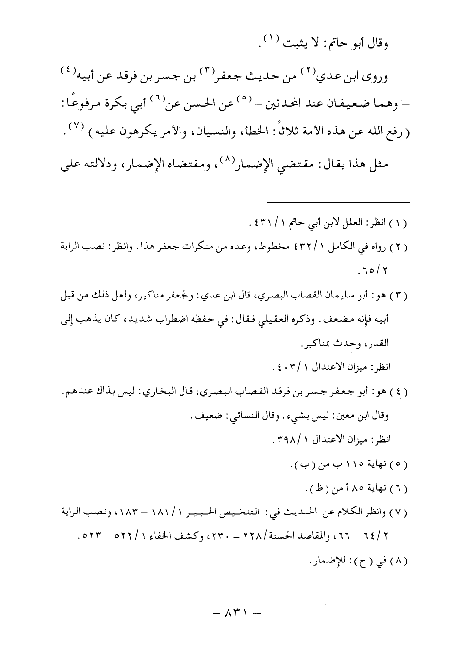 وروى ابن عدي (٢) من حديث جعفر (٣) بن جسر بن فرقد عن أبيه (٤) -وهما ضعيفان عند المحدثين- (٥) عن الحسن عن (٦) أبي بكرة مرفوعًا: (رفع الله عن هذه الأمة ثلاثاً: الخطأ، والنسيان، والأمر يكرهون عليه) (٧).