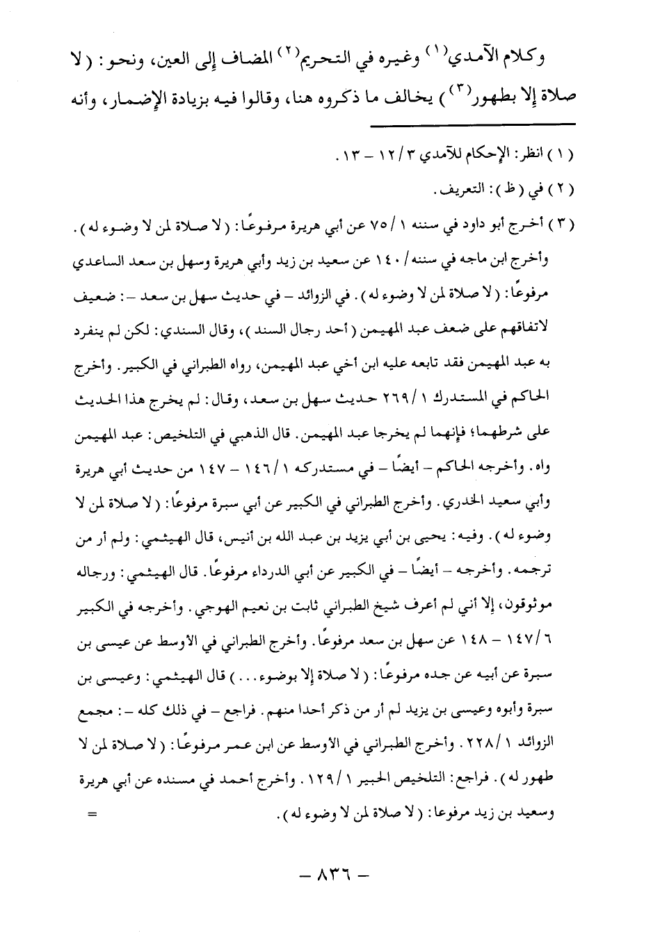 (٣) أخرج أبو داود في سننه ١/ ٧٥ عن أبي هريرة مرفوعًا: (لا صلاة لمن لا وضوء له). وأخرج ابن ماجه في سننه/ ١٤٠ عن سعيد بن زيد وأبي هريرة وسهل بن سعد الساعدي مرفوعًا: (لا صلاة لمن لا وضوء له). في الزوائد -في حديث سهل بن سعد-: ضعيف لاتفاقهم على ضعف عبد المهيمن (أحد رجال السند)، وقال السندي: لكن لم ينفرد به عبد المهيمن فقد تابعه عليه ابن أخي عبد المهيمن، رواه الطبراني في الكبير. وأخرج الحاكم في المستدرك ١/ ٢٦٩ حديث سهل بن سعد، وقال: لم يخرج هذا الحديث على شرطهما؛ فإِنهما لم يخرجا عبد المهيمن. قال الذهبي في التلخيص: عبد المهيمن واه. وأخرجه الحاكم -أيضًا- في مستدركه ١/ ١٤٦ - ١٤٧ من حديث أبي هريرة وأبي سعيد الخدري. وأخرج الطبراني في الكبير عن أبي سبرة مرفوعًا: (لاصلاة لمن لا وضوء له). وفيه: يحيى بن أبي يزيد بن عبد الله بن أنيس، قال الهيثمي: ولم أر من ترجمه. وأخرجه -أيضًا- في الكبير عن أبي الدرداء مرفوعاً. قال الهيثمي: ورجاله موثوقون، إلا أني لم أعرف شيخ الطبراني ثابت بن نعيم الهوجي. وأخرجه في الكبير ٦/ ١٤٧ - ١٤٨ عن سهل بن سعد مرفوعًا. وأخرج الطبراني في الأوسط عن عيسى بن سبرة عن أبيه عن جده مرفوعاً: (لا صلاة إِلا بوضوء ...) قال الهيثمي: وعيسى بن سبرة وأبوه وعيسى بن يزيد لم أر من ذكر أحدا منهم. فراجع -في ذلك كله-: مجمع الزوائد ١/ ٢٢٨. وأخرج الطبراني في الأوسط عن ابن عمر مرفوعًا: (لا صلاة لمن لا طهور له). فراجع: التلخيص الحبير ١/ ١٢٩. وأخرج أحمد في مسنده عن أبي هريرة وسعيد بن زيد مرفوعاً: (لا صلاة لمن لا وضوء له).=