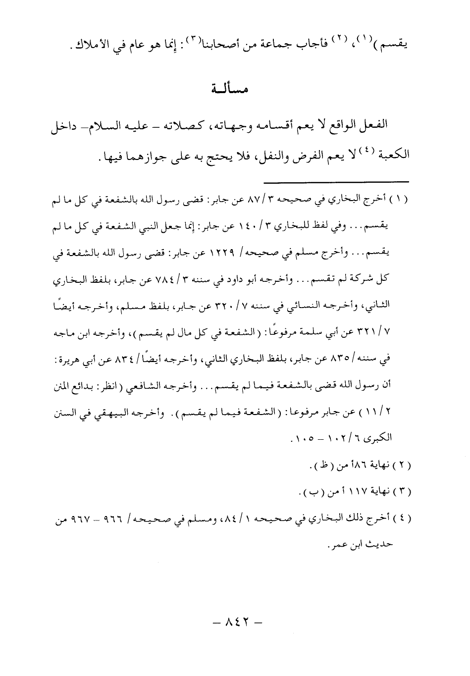 (١) أخرج البخاري في صحيحه ٣/ ٨٧ عن جابر: قضى رسول الله بالشفعة في كل ما لم يقسم ... وفي لفظ للبخاري ٣/ ١٤٠ عن جابر: إِنما جعل النبي الشفعة في كل ما لم يقسم .. - وأخرج مسلم في صحيحه / ١٢٢٩ عن جابر: قضى رسول الله بالشفعة في كل شركة لم تقسم ... وأخرجه أبو داود في سننه ٣/ ٧٨٤ عن جابر، بلفظ البخاري الثاني، وأخرجه النسائي في سننه ٧/ ٣٢٠ عن جابر، بلفظ مسلم، وأخرجه أيضًا ٧/ ٣٢١ عن أبي سلمة مرفوعًا: (الشفعة في كل مال لم يقسم)، وأخرجه ابن ماجه في سننه / ٨٣٥ عن جابر، بلفظ البخاري الثاني، وأخرجه أيضًا/ ٨٣٤ عن أبي هريرة: أن رسول الله قضى بالشفعة فيما لم يقسم ... وأخرجه الشافعي (انظر: بدائع المنن ٢/ ١١) عن جابر مرفوعاً: (الشفعة فيما لم يقسم). وأخرجه البيهقي في السنن الكبرى ٦/ ١٠٢ - ١٠٥.