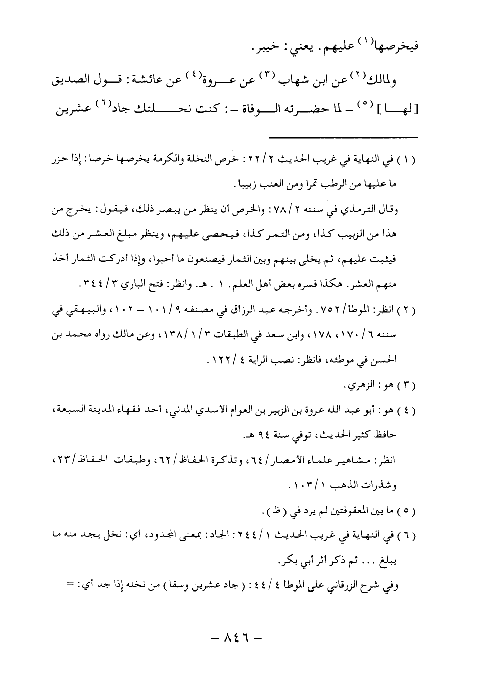 ولمالك (٢) عن ابن شهاب (٣) عن عروة (٤) عن عائشة: قول الصديق [لها] (٥) -لما حضرته الوفاة-: كنت نحلتك جاد (٦) عشرين