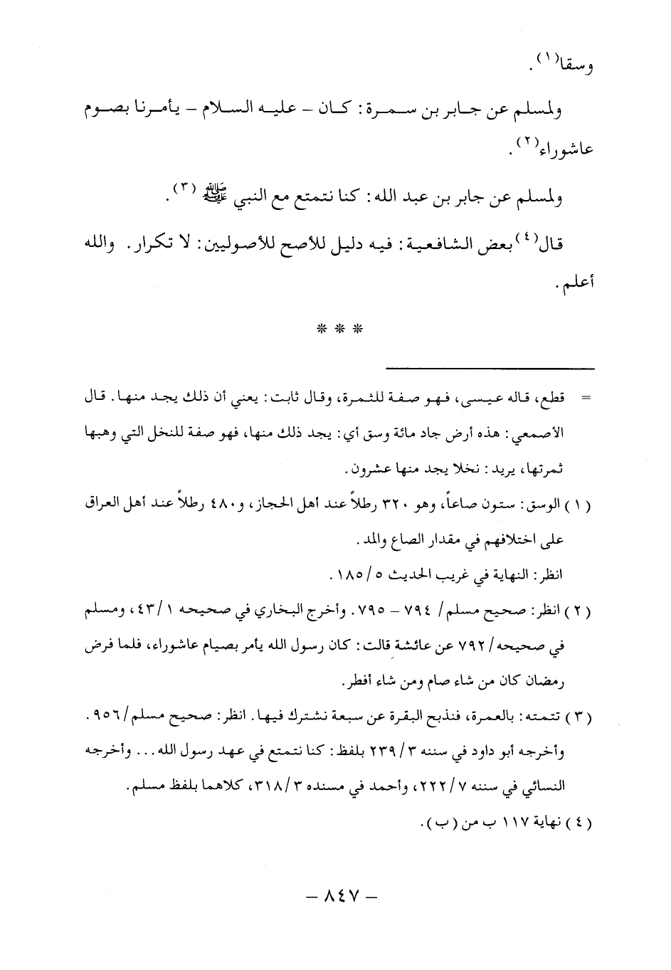 (٣) تتمته: بالعمرة، فنذبح البقرة عن سبعة نشترك فيها. انظر: صحيح مسلم/ ٩٥٦.