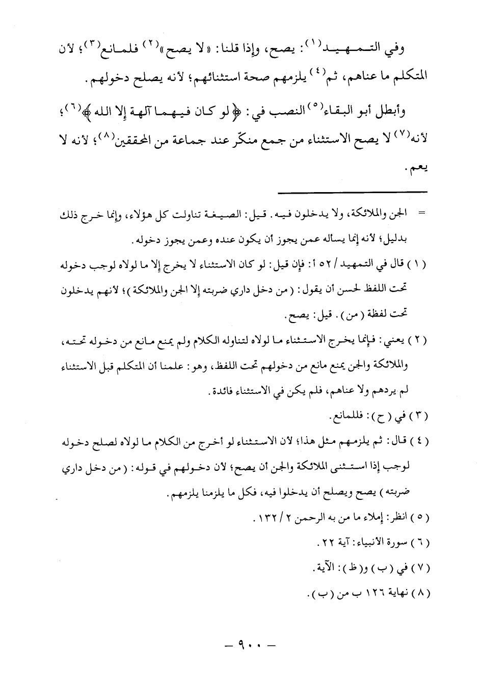 (١) قال في التمهيد/ ٥٢ أ: فإِن قيل: لو كان الاستثناء لا يخرج إِلا ما لولاه لوجب دخوله تحت اللفظ لحسن أن يقول: (من دخل داري ضربته إِلا الجن والملائكة)؛ لأنهم يدخلون تحت لفظة (من). قيل: يصح.