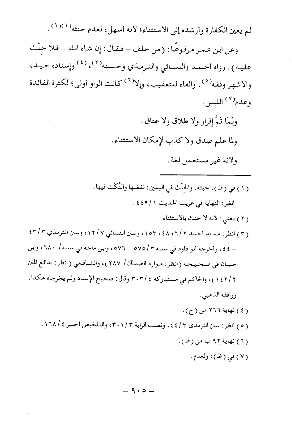 وعن ابن عمر مرفوعًا: (من حلف -فقال: إِن شاء الله- فلا حِنْث عليه). رواه أحمد والنسائي والترمذي وحسنه (٣)، (٤) وإسناده جيد، والأشهر وقفه (٥). والفاء للتعقيب، وإلا (٦) كانت الواو أولى، لكثرة الفائدة وعدم (٧) اللبس.