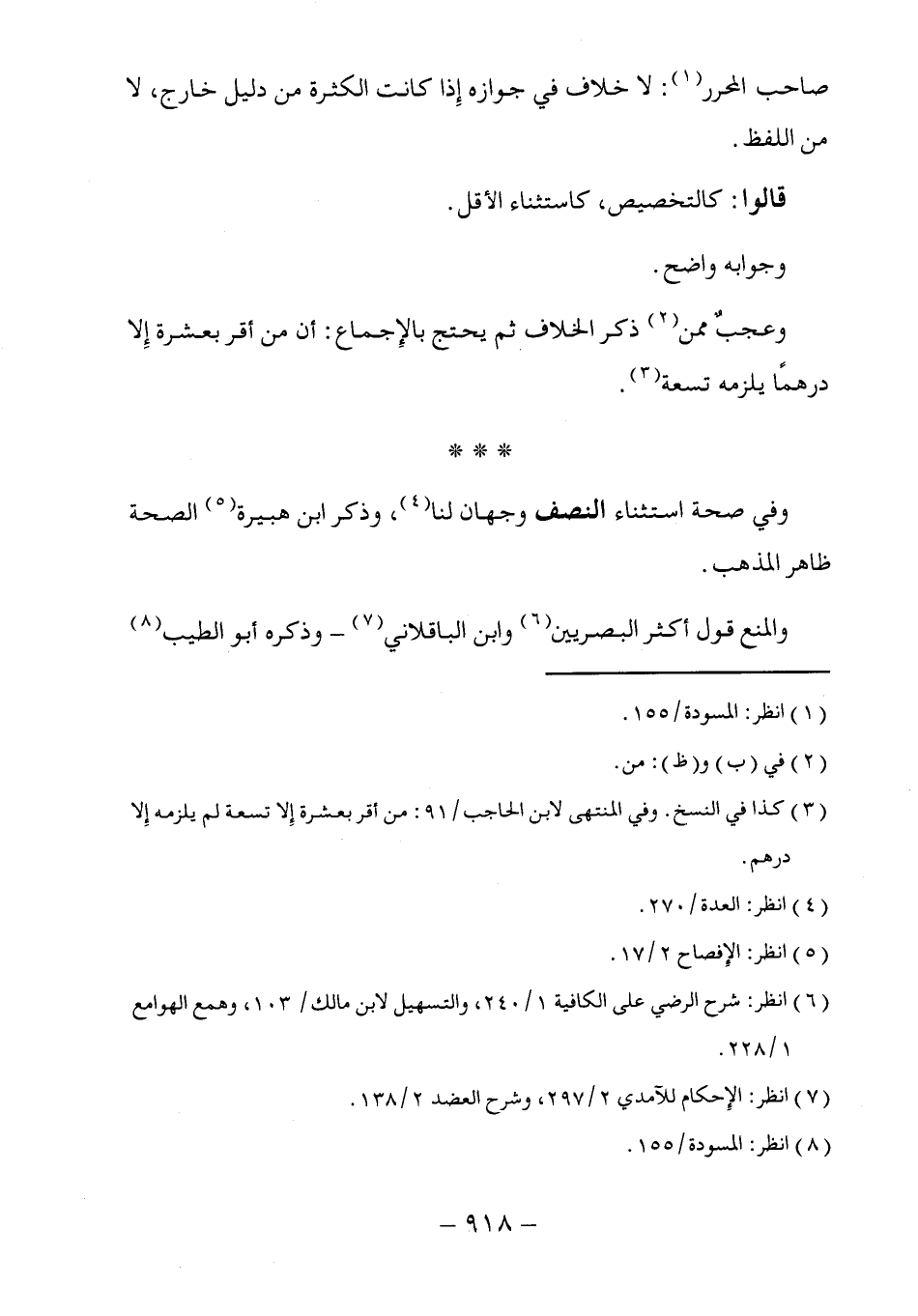 (٣) كذا في النسخ. وفي المنتهى لابن الحاجب/ ٩١: من أقر بعشرة إِلا تسعة لم يلزمه إِلا درهم.