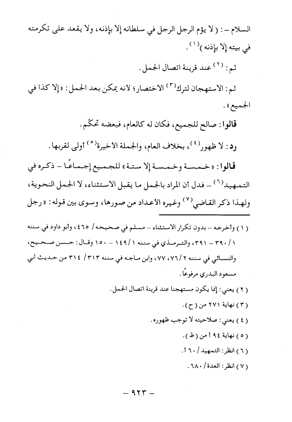 قالوا: "خمسة وخمسة إِلا ستة" للجميع إِجماعًا -ذكره في التمهيد (٦) - فدل أن المراد بالجمل ما يقبل الاستثناء، لا الجمل النحوية، ولهذا ذكر القاضي (٧) وغيره الأعداد من صورها، وسوى بين قوله: "رجل