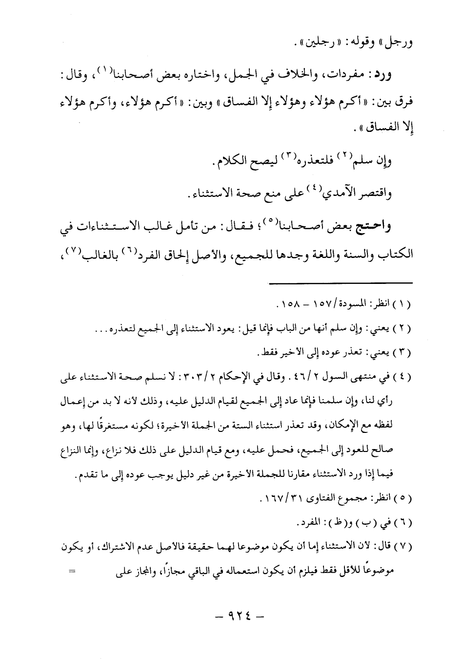 (٤) في منتهى السول ٢/ ٤٦. وقال في الإِحكام ٢/ ٣٠٣: لا نسلم صحة الاستثناء على رأي لنا، وإن سلمنا فإِنما عاد إِلى الجميع لقيام الدليل عليه، وذلك لأنه لا بد من إِعمال لفظه مع الإِمكان، وقد تعذر استثناء الستة من الجملة الأخيرة؛ لكونه مستغرقًا لها، وهو صالح للعود إِلى الجميع، فحمل عليه، ومع قيام الدليل على ذلك فلا نزاع، وإنما النزاع فيما إِذا ورد الاستثناء مقارنا للجملة الأخيرة من غير دليل يوجب عوده إِلى ما تقدم.