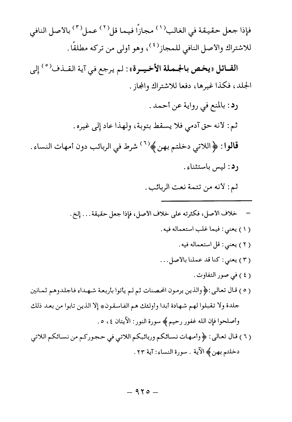 القائل "يخص بالجملة الأخيرة": لم يرجع في آية القذف (٥) إِلى الجلد، فكذا غيرها، دفعا للاشتراك والمجاز.
