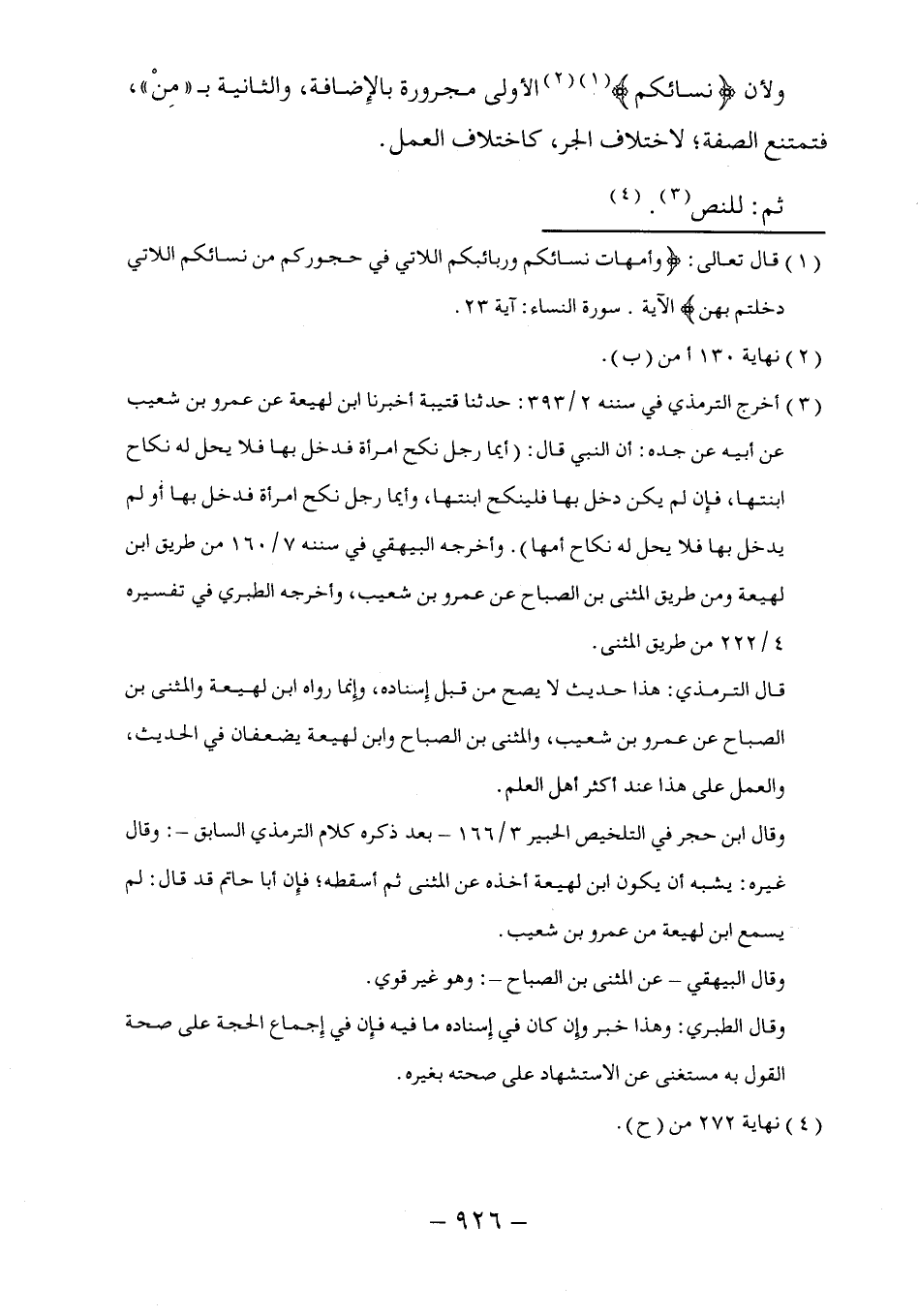 (٣) أخرج الترمذي في سننه ٢/ ٣٩٣: حدثنا قتيبة أخبرنا ابن لهيعة عن عمرو بن شعيب عن أبيه عن جده: أن النبي قال: (أيما رجل نكح امرأة فدخل بها فلا يحل له نكاح ابنتها، فإِن لم يكن دخل بها فلينكح ابنتها، وأيما رجل نكح امرأة فدخل بها أو لم يدخل بها فلا يحل له نكاح أمها). وأخرجه البيهقي في سننه ٧/ ١٦٠ من طريق ابن لهيعة ومن طريق المثنى بن الصباح عن عمرو بن شعيب، وأخرجه الطبري في تفسيره ٤/ ٢٢٢ من طريق المثنى.