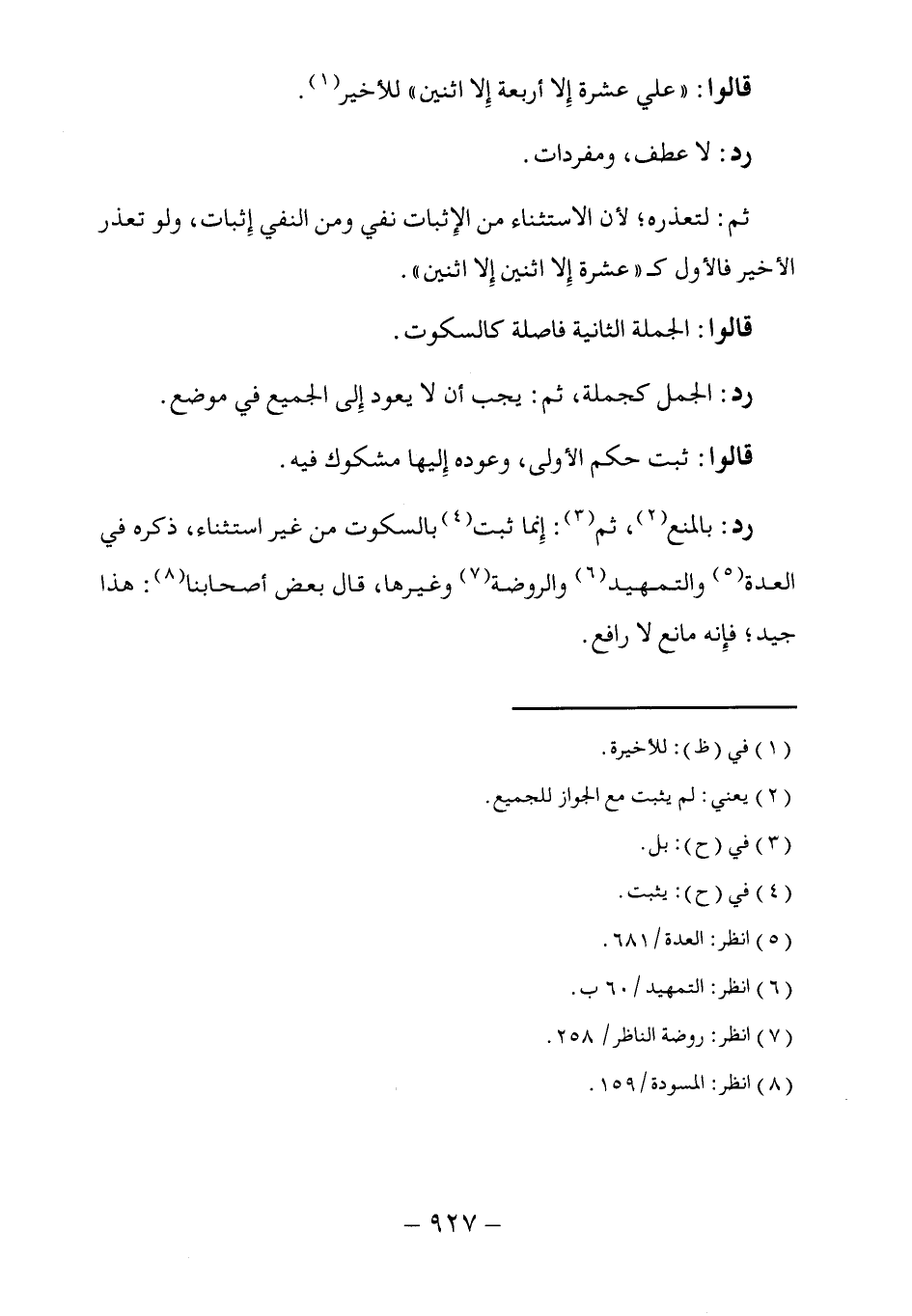 رد: بالمنع (٢)، ثم (٣): إِنما ثبت (٤) بالسكوت من غير استثناء، ذكره في العدة (٥) والتمهيد (٦) والروضة (٧) وغيرها، قال بعض أصحابنا (٨): هذا جيد؛ فإِنه مانع لا رافع.