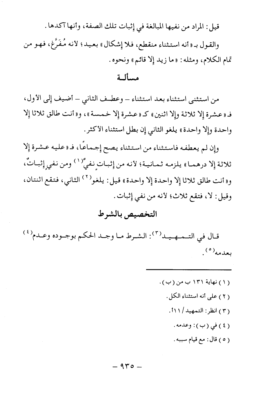 من استثنى استثناء بعد استثناء -وعطف الثاني- أضيف إِلى الأول، فـ "عشرة إِلا ثلاثة وإلا اثنين" كـ "عشرة إِلا خمسة"، و"أنت طالق ثلاثاً إِلا واحدة وإلا واحدة" يلغو الثاني إِن بطل استثناء الأكثر.