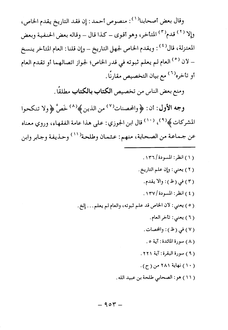 وجه الأول: أن: (والمحصنات (٧) من الذين) (٨) خَصَّ (ولا تنكحوا المشركات) (٩)، (١٠) قال ابن الجوزي: على هذا عامة الفقهاء، وروي معناه عن جماعة من الصحابة، منهم: عثمان وطلحة (١١) وحذيفة وجابر وابن