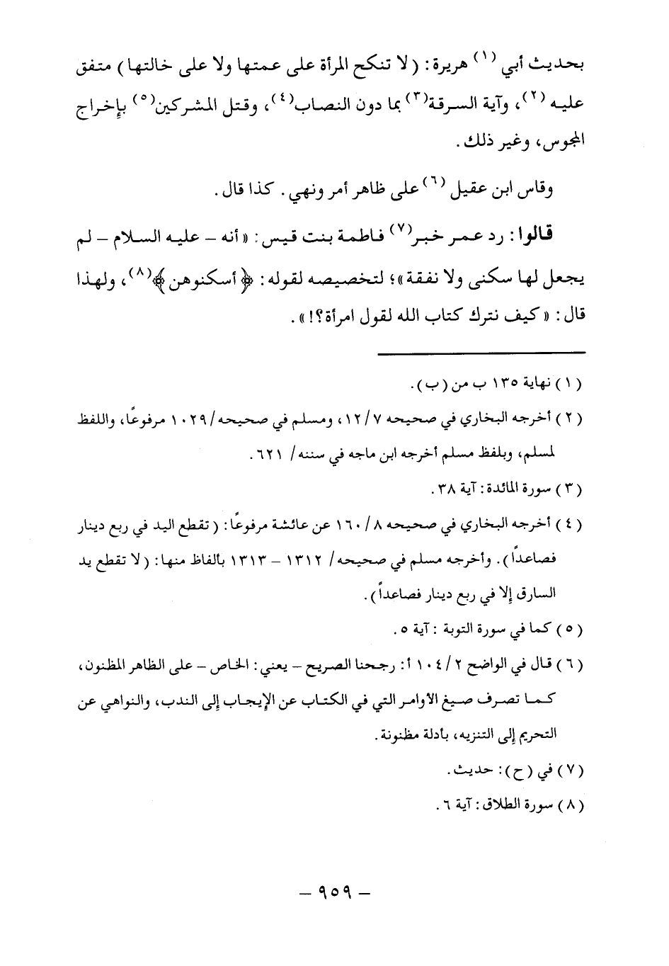بحديث أبي (١) هريرة: (لا تنكح المرأة على عمتها ولا على خالتها) متفق عليه (٢)، وآية السرقة (٣) بما دون النصاب (٤)، وقتل المشركين (٥) بإِخراج المجوس، وغير ذلك.