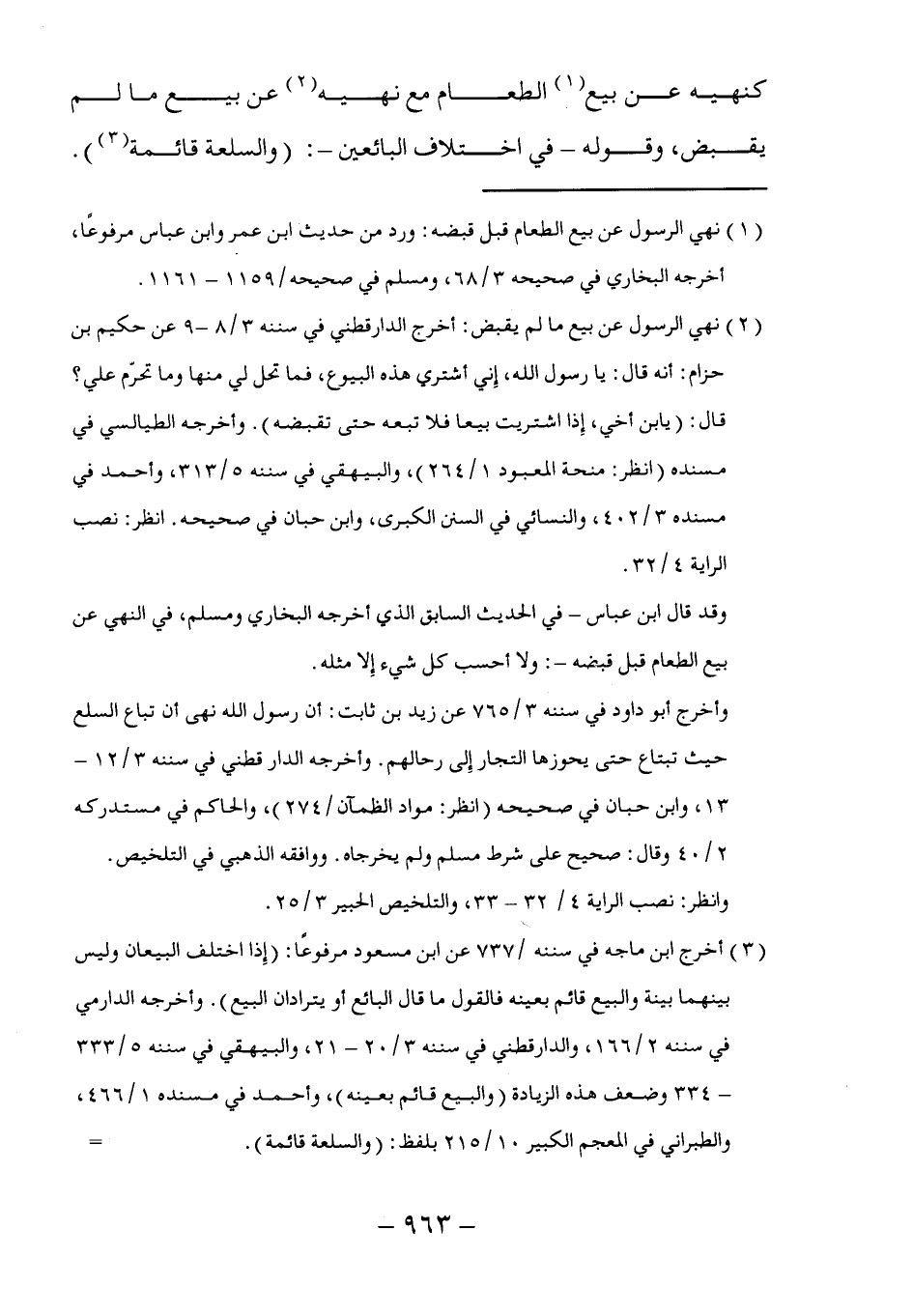 (٢) نهي الرسول عن بيع ما لم يقبض: أخرج الدارقطني في سننه ٣/ ٨ - ٩ عن حكيم بن حزام: أنه قال: يا رسول الله، إِني أشتري هذه البيوع، فما تحل لي منها وما تحرّم علي؟ قال: (يابن أخي، إذا اشتريت بيعا فلا تبعه حتى تقبضه). وأخرجه الطيالسي في مسنده (انظر: منحة المعبود ١/ ٢٦٤)، والبيهقي في سننه ٥/ ٣١٣، وأحمد في مسنده ٣/ ٤٠٢، والنسائي في السنن الكبرى وابن حبان في صحيحه. انظر: نصب الراية ٤/ ٣٢.