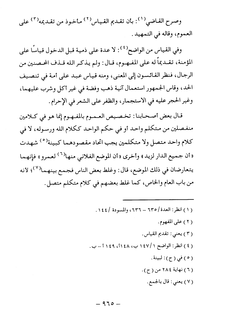 وفي القياس من الواضح (٤): لا عدة على ذمية قبل الدخول قياسًا على المؤمنة، تقديماً له على المفهوم، قال: ولم يذكر الله قذف المحصنين من الرجال، فنظر القائمون إِلى المعنى، ومنه قياس عبد على أمة في تنصيف الحد، وقاس الجمهور استعمال آنية ذهب وفضة في غير أكل وشرب عليهما، وغير الحجر عليه في الاستجمار، والظفر على الشعر في الإِحرام.