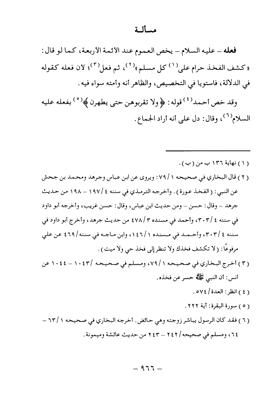 فعله - عليه السلام - يخص العموم عند الأئمة الأربعة، كما لو قال: "كشف الفخذ حرام على (١) كل مسلم" (٢)، ثم فعل (٣)؛ لأن فعله كقوله في الدلالة، فاستويا في التخصيص، والظاهر أنه وأمته سواء فيه.
