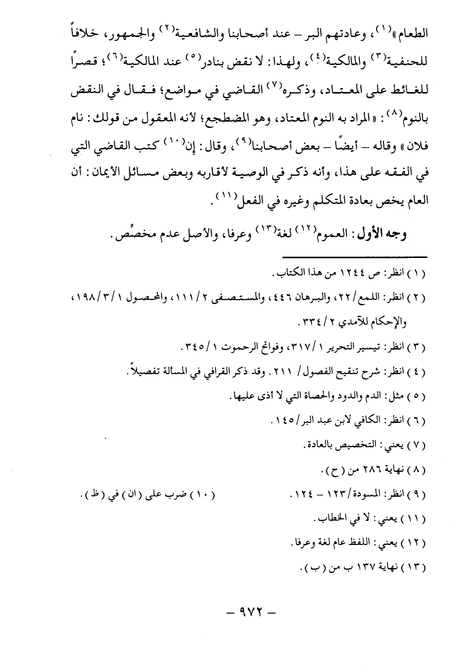 الطعام" (١)، وعادتهم البر- عند أصحابنا والشافعية (٢) والجمهور، خلافاً للحنفية (٣) والمالكية (٤)، ولهذا: لا نقض بنادر (٥) عند المالكية (٦)، قصرًا للغائط على المعتاد، وذكره (٧) القاضي في مواضع؛ فقال في النقض بالنوم (٨): "المراد به النوم المعتاد، وهو المضطجع؛ لأنه المعقول من قولك: نام فلان" وقاله -أيضًا- بعض أصحابنا (٩)، وقال: إِن (١٠) كتب القاضي التي في الفقه على هذا، وأنه ذكر في الوصية لأقاربه وبعض مسائل الأيمان: أن العام يخص بعادة المتكلم وغيره في الفعل (١١).