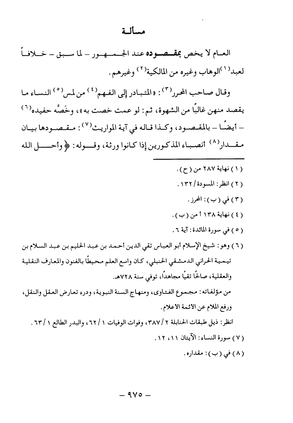 (٦) وهو: شيخ الإِسلام أبو العباس تقي الدين أحمد بن عبد الحليم بن عبد السلام بن تيمية الحراني الدمشقي الحنبلي، كان واسع العلم محيطًا بالفنون والمعارف النقلية والعقلية، صالحًا تقيًا مجاهدًا، توفي سنة ٧٢٨ هـ.