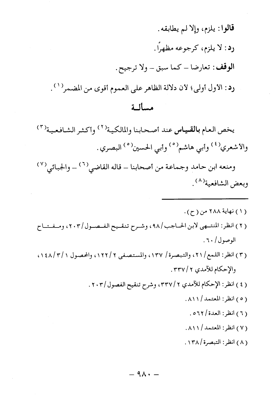 (٢) انظر: المنتهى لابن الحاجب/ ٩٨، وشرح تنقيح الفصول / ٢٠٣، ومفتاح الوصول/ ٦٠.