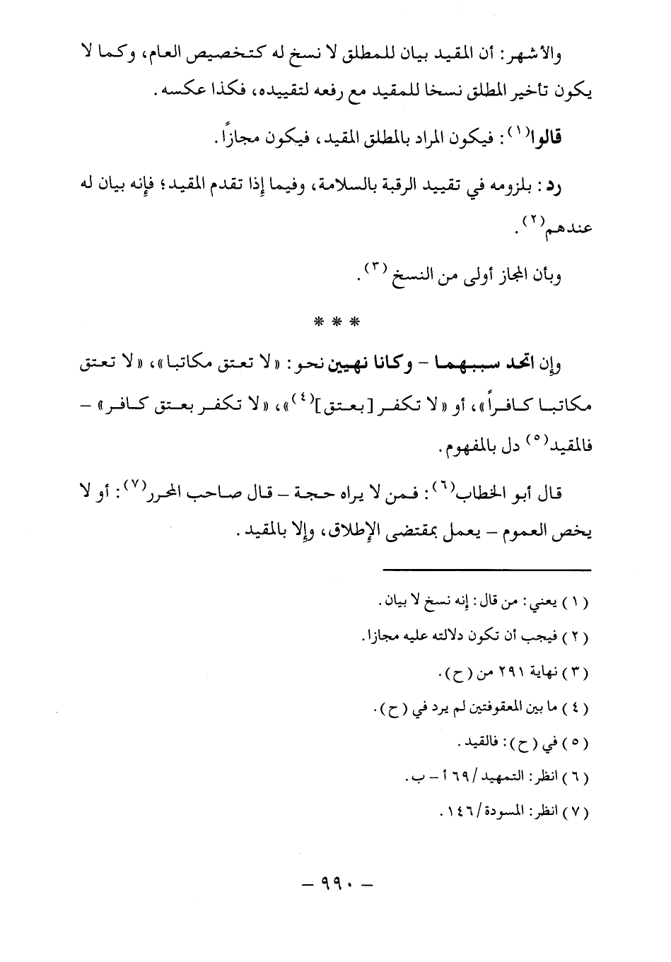 رد: بلزومه في تقييد الرقبة بالسلامة، وفيما إِذا تقدم المقيد؛ فإِنه بيان له عندهم (٢).