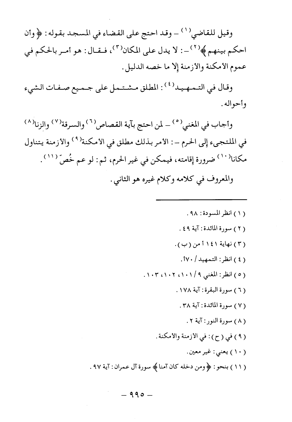 وأجاب في المغني (٥) -لمن احتج بآية القصاص (٦) والسرقة (٧) والزنا (٨) في الملتجىء إِلى الحرم-: الأمر بذلك مطلق في الأمكنة (٩) والأزمنة يتناول مكانا (١٠) ضرورة إِقامته، فيمكن في غير الحرم، ثم: لو عم خُصّ (١١).