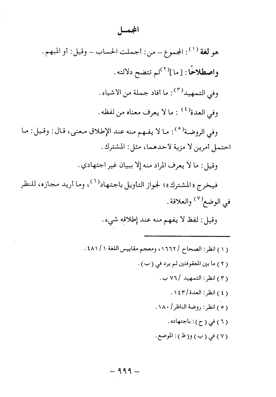 هو لغة (١): المجموع -من: أجملت الحساب- وقيل: أو المبهم.