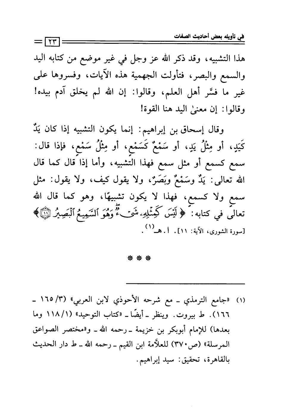 (¬1) "جامع الترمذي- مع شرحه الأحوذي لابن العربي" (3/ 165 - 166). ط بيروت. وينظر -أيضًا- "كتاب التوحيد" (1/ 118 وما بعدها) للإمام أبو بكر بن خزيمة - رحمه الله - و"مختصر الصواعق المرسلة" (ص 370) للعلَّامة ابن القيم - رحمه الله - ط دار الحديث بالقاهرة، تحقيق: سيد إبراهيم.