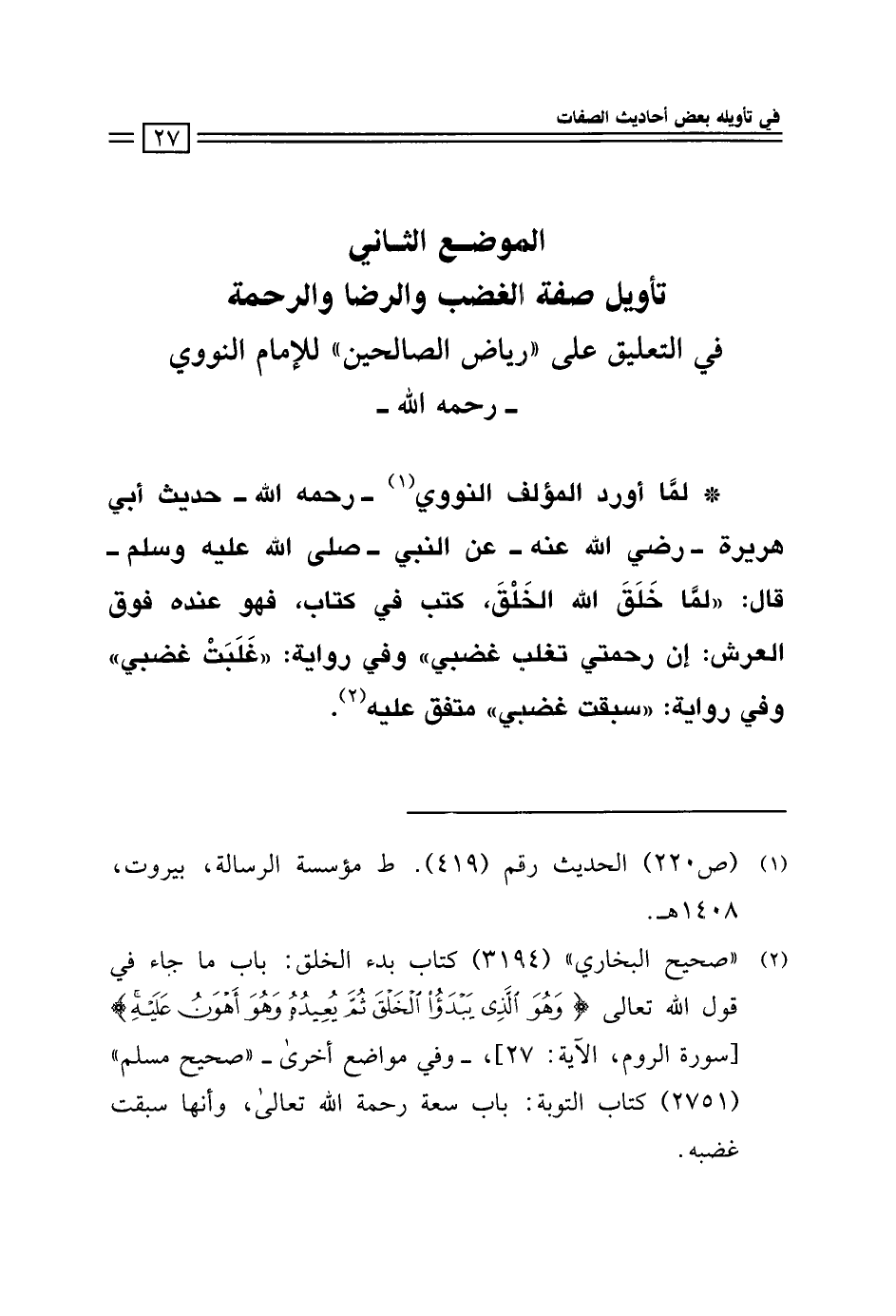* لمَّا أورد المؤلف النووي (¬1) - رحمه الله - حديث أبي هريرة -رضي الله عنه - عن النبي - صلى الله عليه وسلم - قال: "لمَّا خَلَقَ الله الخَلْقَ، كتب في كتاب، فهو عنده فوق العرش: إن رحمتي تغلب غضبي" وفي رواية: "غَلَبَتْ غضبي" وفي رواية: "سبقت غضبي" متفق عليه (¬2).