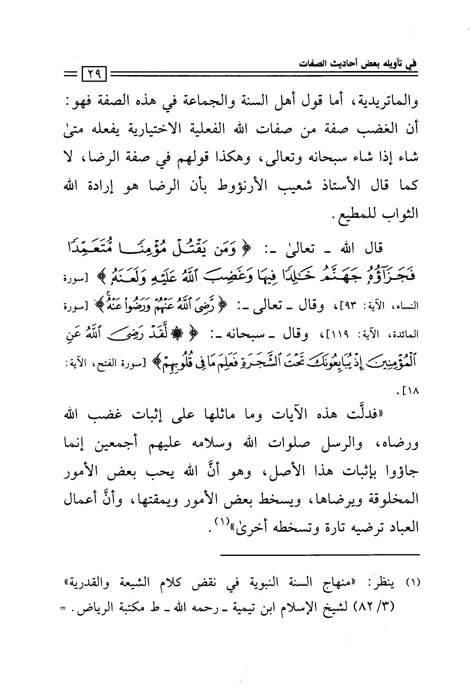 والماتريدية، أما قول أهل السنة والجماعة في هذه الصفة فهو: أن الغضب صفة من صفات الله الفعلية الاختيارية يفعله متى شاء إذا شاء سبحانه وتعالى، وهكذا قولهم في صفة الرضا، لا كما قال الأستاذ شعيب الأرنؤوط بأن الرضا هو إرادة الله الثواب للمطيع.
