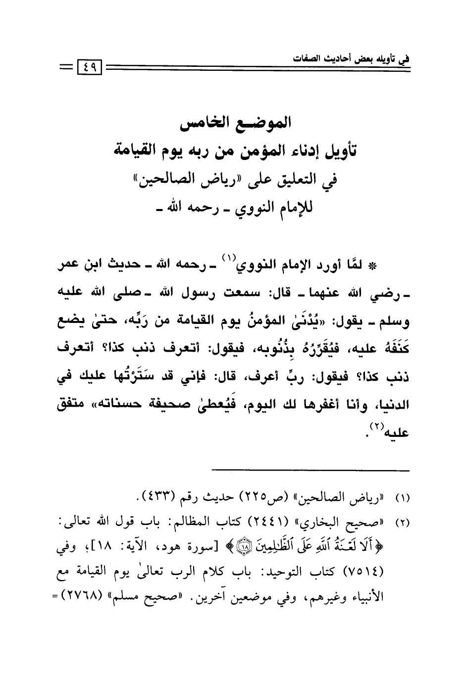 * لمَّا أورد الإِمام النووي (¬1) - رحمه الله - حديث ابن عمر -رضي الله عنهما- قال: سمعت رسول الله- صلى الله عليه وسلم - يقول: "يُدْنَى المؤمنُ يوم القيامة من رَبِّه، حتى يضع كَنَفَهُ عليه، فيقَرِّرُهُ بِذُنُوبه، فيقول: أتعرف ذنب كذا؟ أتعرف ذنب كذا؟ فيقول: ربِّ أعرف، قال: فإني قد سَتَرْتُها عليك في الدنيا، وأنا أغفرها لك اليوم، فَيُعطى صحيفة حسناته" متفق عليه (¬2).