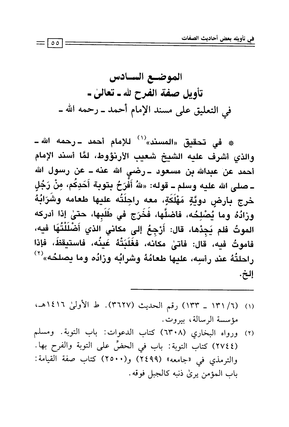 * في تحقيق "المسند" (¬1) للإمام أحمد - رحمه الله - والذي أشرف عليه الشيخ شعيب الأرنؤوط، لمَّا أسند الإِمام أحمد عن عبد الله بن مسعود -رضي الله عنه - عن رسول الله - صلى الله عليه وسلم - قوله: "للهُ أَفْرَحُ بتوبة أَحَدِكُم، مِنْ رَجُلٍ خرج بأرضٍ دويَّةٍ مَهْلَكَةٍ، معه راحِلَتُه عليها طعامه وشَرَابُهُ وزادُهُ وما يُصْلِحُه، فأضلَّها، فَخَرَج في طَلَبِها، حتى إذا أدركه الموتُ فلم يَجِدْها، قال: أَرْجِعُ إلى مكاني الذي أَضْلَلْتُهَا فيه، فأموت فيه، قال: فأتى مكانه، فغَلَبَتْهُ عَينُه، فاستيقظَ، فإذا راحلتُهُ عند رأسِه، عليها طعامُهُ وشرابُه وزادُه وما يصلحُه" (¬2) إلخ.