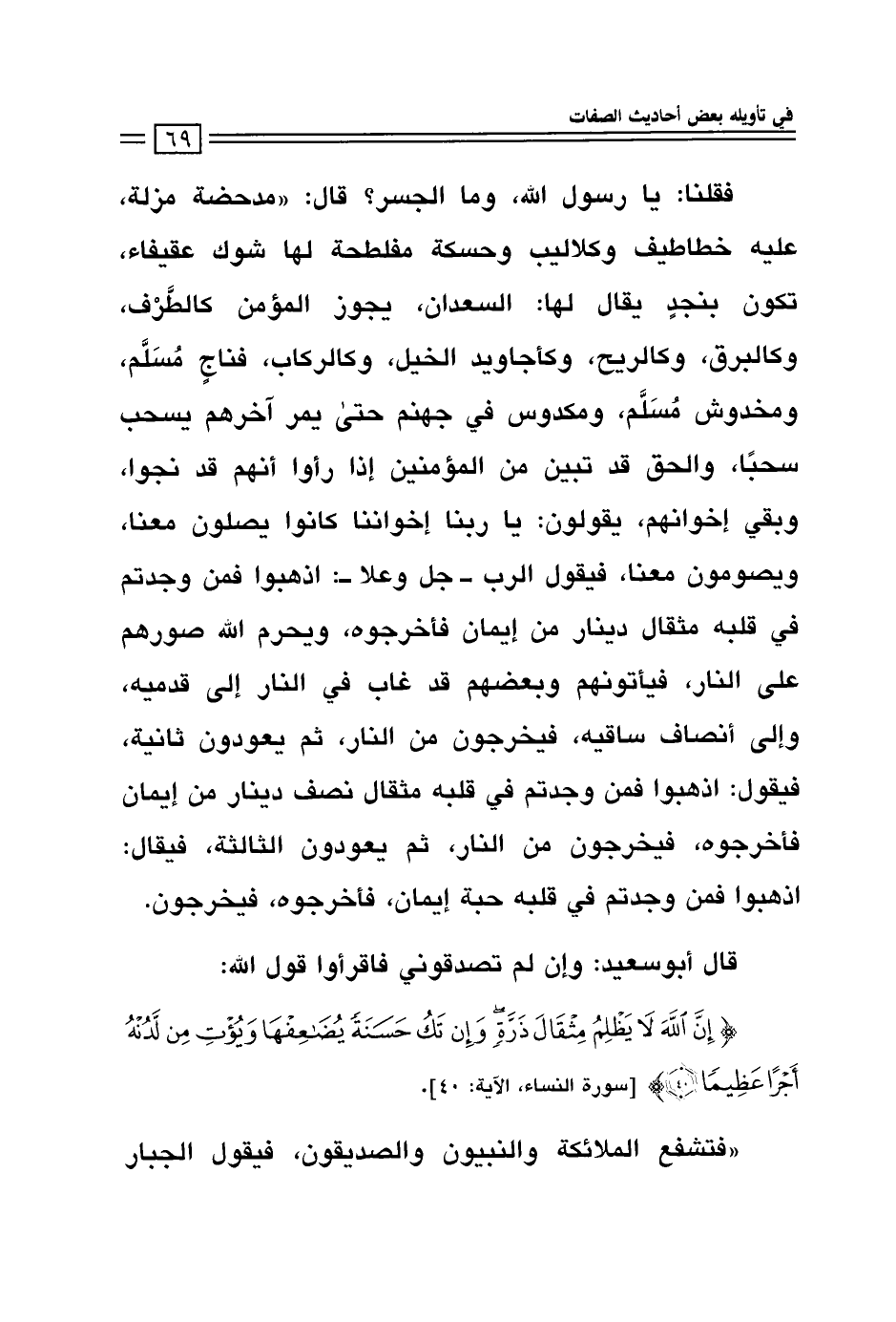 فقلنا: يا رسول الله، وما الجسر؟ قال: "مدحضة مزلة، عليه خطاطيف وكلاليب وحسكة مفلطحة لها شوك عقيفاء، تكون بنجدٍ يقال لها: السعدان، يجوز المؤمن كالطَّرْف، وكالبرق، وكالريح، وكأجاويد الخيل، وكالركاب، فناجٍ مُسَلَّم، ومخدوش مُسَلَّم، ومكدوس في جهنم حتى يمر آخرهم يسحب سحبًا، والحق قد تبين من المؤمنين إذا رأوا أنهم قد نجوا، وبقي إخوانهم، يقولون: يا ربنا إخواننا كانوا يصلون معنا، ويصومون معنا، فيقول الرب -جل وعلا-: اذهبوا فمن وجدتم في قلبه مثقال دينار من إيمان فأخرجوه، ويحرم الله صورهم على النار، فيأتونهم وبعضهم قد غاب في النار إلى قدميه، وإلى أنصاف ساقيه، فيخرجون من النار، ثم يعودون ثانية، فيقول: اذهبوا فمن وجدتم في قلبه مثقال نصف دينار من إيمان فأخرجوه، فيخرجون من النار، ثم يعودون الثالثة، فيقال: اذهبوا فمن وجدتم في قلبه حبَّة إيمان، فأخرجوه، فيخرجون.