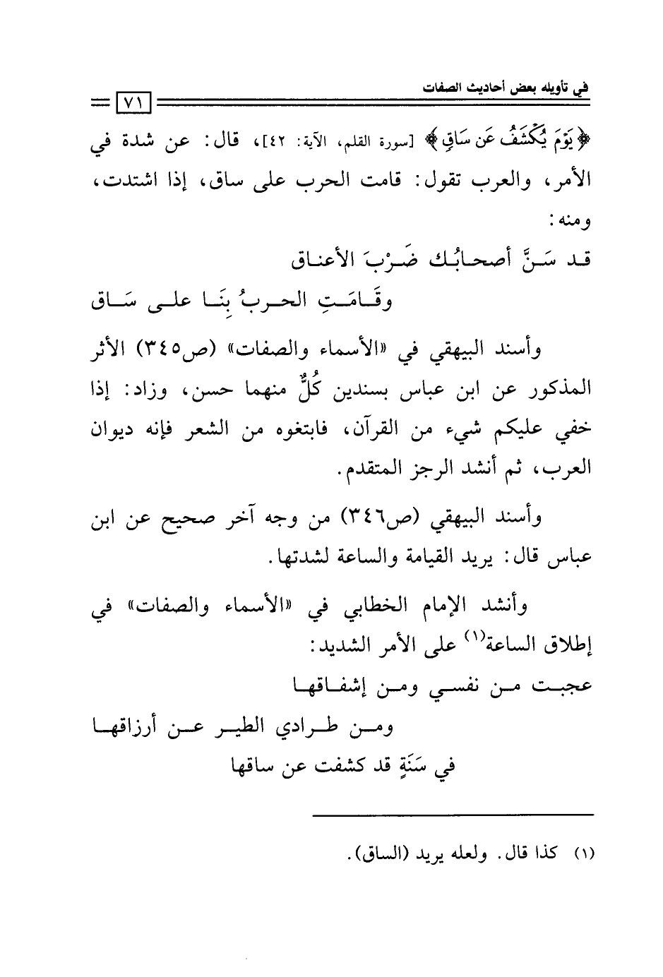 {يَومَ يُكشَفُ عَن سَاقٍ} [سورة القلم، الآية: 42]، قال: عن شدة في الأمر، والعرب تقول: قامت الحرب على ساق، إذا اشتدت، ومنه: